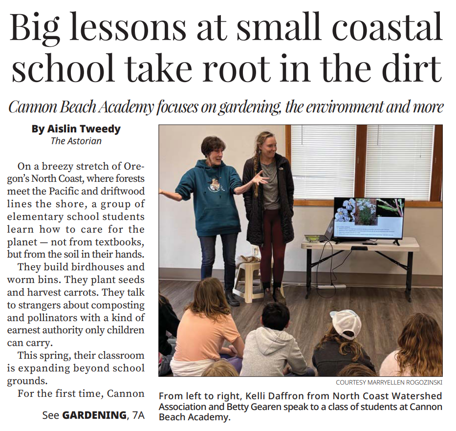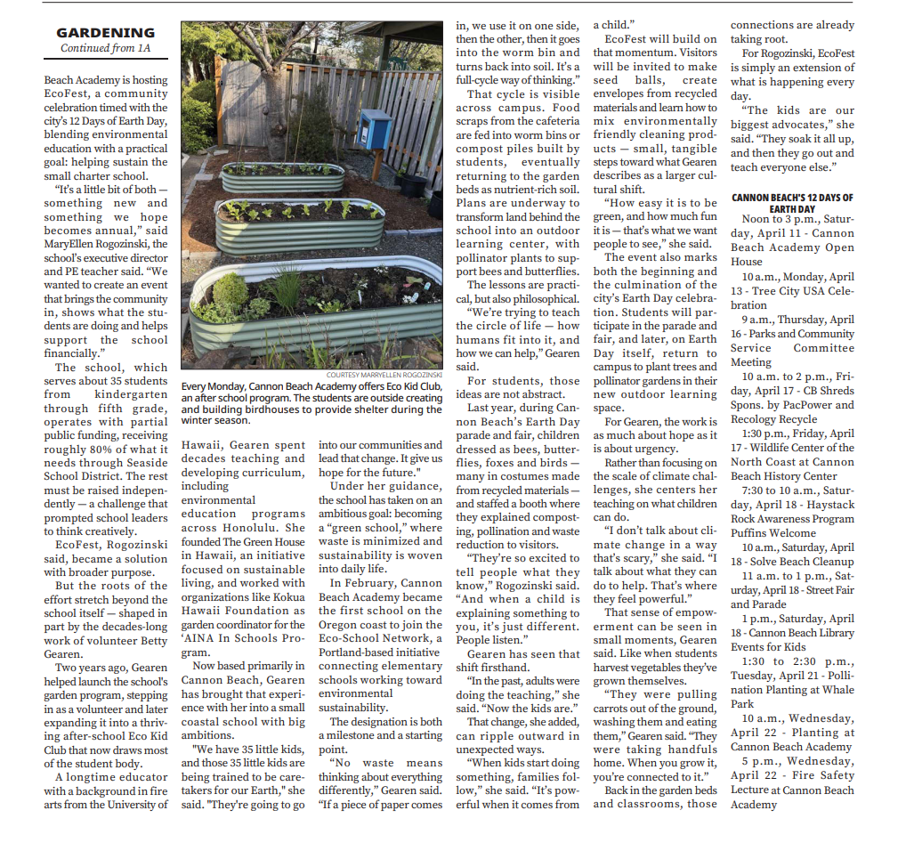 Eco Kids Club (Mondays): This fun club is led by our amazing volunteers Ms. Betty & Papa Mike! The kids are working in the garden, feeding the worms (in the worm bin), and building bird houses and a compost bin. They are taking care of our newly hatched Mason Bees and most recently created costumes and walked in the 12 Days of Earth Day Parade in downtown Cannon Beach.